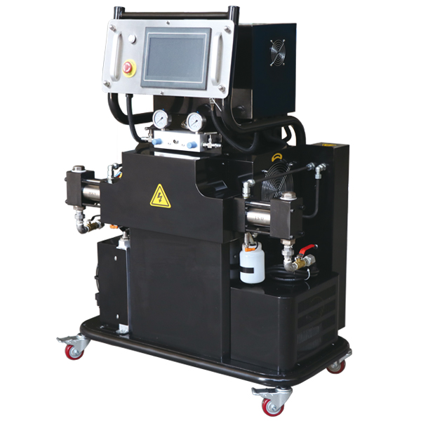 该设备搭载双作用活塞配比泵系统,每个泵由液压缸单独驱动,能够细致把控输送每种组分,实现稳定的1:1混合比。35MPa的输出压力和2-24kg/min的可调产量,既能满足大面积施工的效率需求,也能适应精细作业的精度要求。
